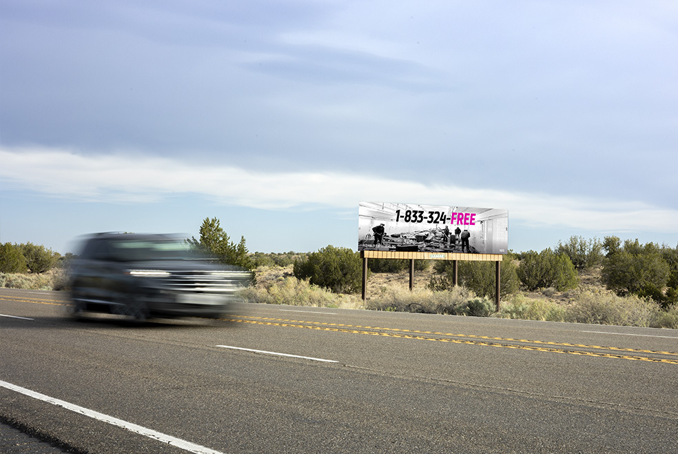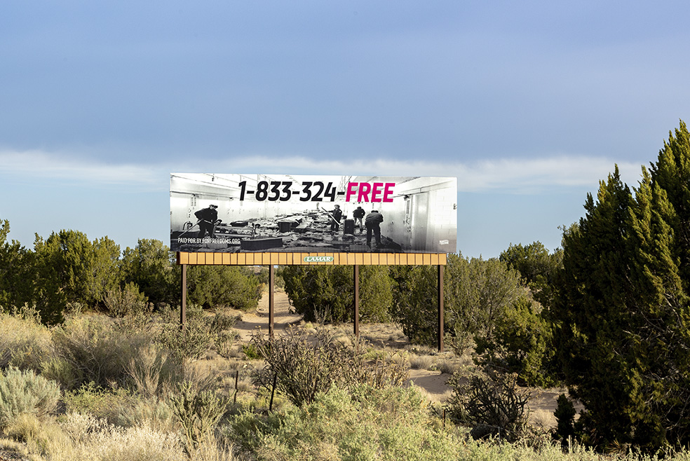 This billboard titled “1-833-324-FREE” by fronteristxs collective has been installed in San Ysidro, NM